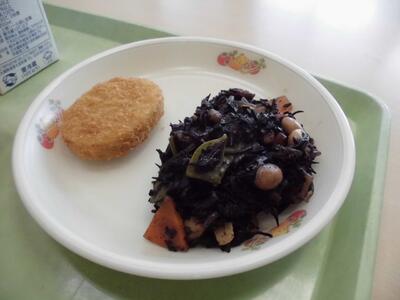 ごはん 牛乳 カレーコロッケ 五目煮 キャベツのみそ汁