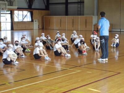 今回は1回目で、「投げる」について、わかりやすくポイントを教えていただきました。今回は、柔らかくて少し軽いボールを使っての練習でした。子どもたちは、指導されたポイントを意識をしながら楽しく学ぶことができました。