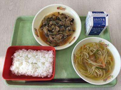 今日の献立は、セルフ豚キムチ丼(ご飯、具)、塩ラーメン風スープ、牛乳でした。