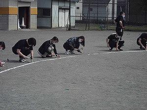 5月25日(月)の登校日の午後、なかなか暑い日差しの中でしたが、整地された校庭に新しいコースロープを張りました。地面が固く、金属製の杭が曲がってしまう事件が多数勃発しました。みんなが元気に走り回ることを想像しながら設置しました。