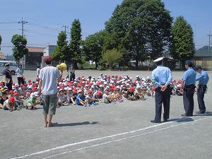 日差しが眩しく、自然に汗が噴き出る中、交通安全教室を開催しました。