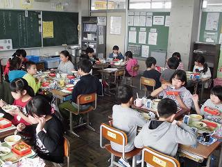 教室をのぞいてみると、年度末のため学校の白衣ではなく各自のエプロンを着けて配膳をしていました。5年生はお別れ給食としていつものグループとは違った形で楽しそうに食べていました。