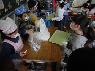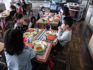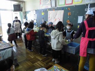 1年生の教室を覗いてみると、自分たちでどんどん配膳が行われていました。温度の高いものは教師が盛り付けますが、流れるように配膳がなされるようすを見ると、1年間でこんなに上手に出来るようになるのだということが分かります。順番を待つ子たちもしっかり待っていました。