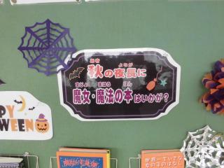 また、図書支援員さんとお手伝いの子供たちが、ハロウィンの季節に合わせて「読書の秋」を啓発する掲示をしました。