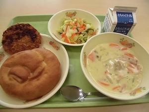 いちごの米粉パン 牛乳 ハムカツ フレンチサラダ クラムチャウダー