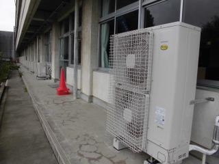 さて、今日の学校はというと、毎度同じようで恐縮ですが、エアコン工事の様子をニュースにします。現在は室外機の設置が進んでおり、1階には設置が終わり、今日は2階以上に室外機を運び上げる作業が行われていました。