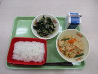 本日メニューは、「塩(エン)ジョイランチ」で、ごはん、親子煮(おやこに)、のり和え(あえ)、牛乳(ぎゅうにゅう)です。塩ジョイランチは、食材を工夫して、調理することで塩分が少なくても美味しく食られるように考えられています。その工夫に対して調理員さんに感謝です。