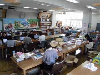 さらに、連日図書室で図書管理の電子化に向けた作業をしてくださった6名の図書支援員さんたちは、本日が作業の最終日です。今日は、他校の作業を終えた3名の方が応援に来てくださいました。総勢9名でお仕事をしてくださっています。