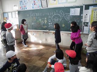 やっていたのは、2学期の行事や出来事のワンシーンを寸劇で演じ合い、その事と関係する自作のイラストが描かれているカードを、カルタ取り方式で取り合うという楽しいゲームでした。劇で演じられるコミカルな動作に笑顔が広がり、関係するカードを探し当てる真剣な手の動きに注目が集まり、2学期の出来事をみんなで振り返るとてもいい雰囲気が教室に広がっていました。