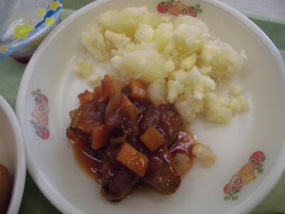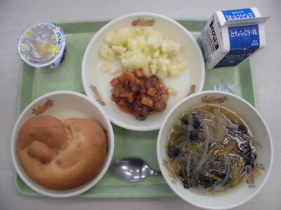 丸パン 牛乳 ハンバーグカラフルソースかけ チーズポテト 七夕春雨スープ 七夕ゼリー