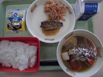 ごはん 牛乳 いわしのごま味噌煮 おかか和え 鶏ごぼう汁 福豆
