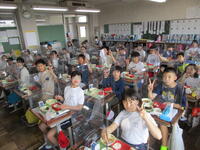 6年1組の給食の様子です。冷ややっこを美味しくいただいていました。