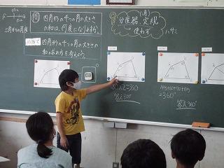 本時は、「四角形の4つの角の大きさの和の求め方を考えよう」をめあてに、今までに学習した「三角形の内角の和」をもとに考えることができました。みんなよく参加し、よく考えることができた授業でした。