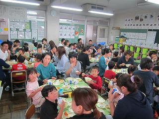 内容は、「ふれあい活動&ドッジボール」、そして「食」についての栄養士の講話、さらに「親子給食」と内容の濃いものでした。皆で「スポーツの秋」、「食欲の秋」を楽しんでいました。