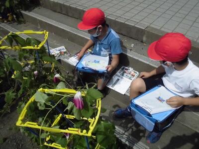 今日は1組でアサガオの観察をしました。アサガオのつるが隣の人のアサガオとからまって、写真のような状況で観察をするまでに時間がかかってしまいました。