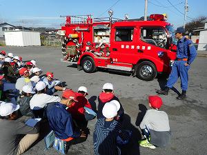 11月19日(火)に、消防団第3分団長さんをはじめとする消防団の皆様、消防署の方々にお世話になり、消防団の仕事について学習しました。消火器を使う練習をしたり、消防車に乗ったり、防火服を着たりと「百聞は一見にしかず」です。