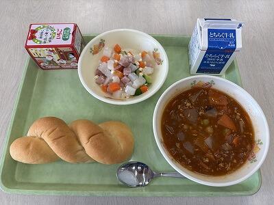 今日の献立は、牛乳ツイストパン、チリコンカン、カリコリサラダ、セレクトケーキ、牛乳でした。