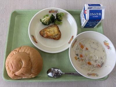 今日の献立は、バターロール、チキンのオーブン焼き、ブロッコリー、クラムチャウダー、牛乳でした。