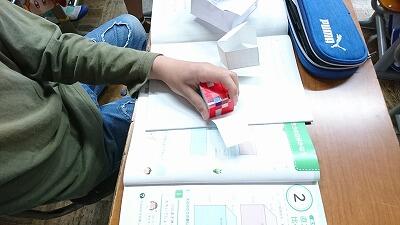 展開図を組み立ててつくった二つの立体のかさの大きさを、小さな立方体がいくつ入るかで比較しました。