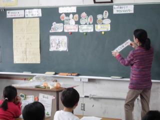 3校時には、祖父母の皆さんに先生になっていただき、1年生たちが「昔の遊び」を体験し、そのようすを保護者の皆さんが参観され、一緒に昔遊びに加わるといった3世代交流の場面も観られました。2年生では、栄養教諭による「食育」の授業が行われ、参観の保護者も一緒に学んでいました。