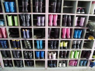 1年生の靴箱は小さくかわいい長靴がびっしり。        6年生の長靴は大きくて靴箱に収まりません。