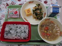 火曜日:ご飯、牛乳、鶏唐揚げのレモンソースかけ、ナムル、石狩汁、セノビーゼリー