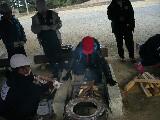 海水を持ってきます。          かまどの準備をします。     海水を煮詰めます。