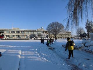 13時過ぎたころから雪が舞い始め、約2時間経ちました。そんな中、先ほど1年生から3年生が下校の途につきました。