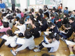 「6年生を送る会」を月末に控え、5年生以下の子供たちが縦割り班で集まって、その準備に取り組みました。写真は寄せ書き色紙を作っているところです。6年生達は、司会者、説明者も準備して、学年全体で遊びました。
