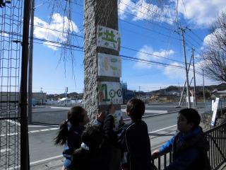 4年生がお祝いのボードを作ってくれました。今週一杯門柱に飾りたいと思います。 今日は強風のため、いったんはずしました。)