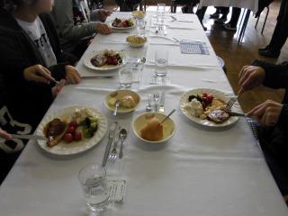 今日と来週に分けて、6年生2学級が給食でテーブルマナーを勉強します。今日は1組が行いました。いつもの特別活動室がテーブルクロスとBGMによってレストランのようになりました。ボランティアの方々にお手伝いいただき、栄養教諭のマナー指導を受けながら、ナイフ、フォーク、スプーン、ナプキン等を実際に扱って給食をいただきました。子供たちは戸惑いながらも楽しい食事の一時となったようです。来週は6年2組が体験します。