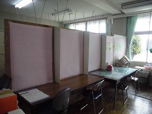 もし、体調が悪いときやケガをしたときに保健室を利用します。今までは、発熱者やけがの児童を同じ空間で対応してきましたが、今後は、同じ保健室でも空間を仕切って対応をするために、写真のように準備しました。(本校は空き教室がありません)また、非接触型の体温計で測定できるよう準備しました。