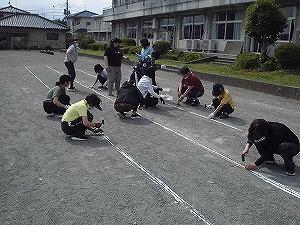 5月25日(月)の登校日の午後、なかなか暑い日差しの中でしたが、整地された校庭に新しいコースロープを張りました。地面が固く、金属製の杭が曲がってしまう事件が多数勃発しました。みんなが元気に走り回ることを想像しながら設置しました。