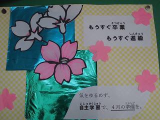 年度末と年度初めの春休みにはいわゆる「宿題」がありませんので、家庭学習は、意識しないとつい疎かになりがちです。学校では、教師からの働きかけの他、校内の掲示物等でも子供たちへの意識付けを図っています。新しい教科書が手元に届くまでは、今年度の復習が中心になるとは思いますが、しっかり定着させて新学期を迎えたいものです。なお、図書室は、間もなく本の貸し出し期間が終了しますのでご了承ください。
