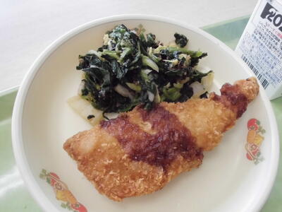 ご飯 牛乳 おかか和え ホッケフライ 里芋と大根のそぼろ煮