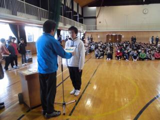 そんな意味から、今日、給食委員会が『給食集会』を開きました。本校の給食は民間委託になって2年目ですが、毎日おいしい給食を作ってくださる調理員さん達に感謝の気持ちを伝えるというねらいをもって行いました。メッセージと手作りメダルを贈呈し、インタビューも行いました。そして栄養教諭から鹿沼の特産物「ニラ」についての講話も聞きました。