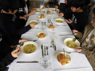 先週の6年1組に続いて、今日の給食の時間に6年2組がテーブルマナーを体験学習しました。ボランティアとして保護者とKLVの皆さんがサポートしてくださいました。