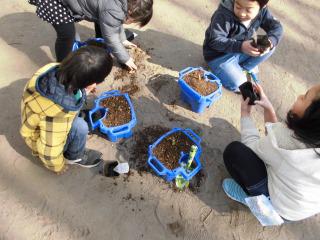 そんな寒さの残る中、午前中1年生が「生活科」でチューリップの球根を各自の鉢に植えていました。花の色によって咲く時期が異なりますが、子供たちは「早く咲いて欲しい」「私のは『白』!」「僕は『赤』だよ!」と今から春を心待ちにしていました。チューリップが咲く頃には、1年生達は2年生になり、新一年生が入学してくることでしょう。