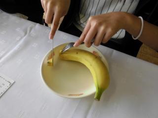 苦心してナイフとフォークで皮をむいて食べたバナナは、いつものバナナとはひと味違ったおいしさだったとか。ラストのアイスは普通にスプーンで食べられるので、安心したように見えましたが、そこにたどり着くまでに疲れてしまい、放心状態でアイスを食べている子もいました。