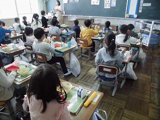 初めての学校給食。おかわりをする1年生も大勢いました。