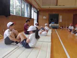 本日は曇天で涼しい日です。2日目は、2年生、3年生、5年生が体力テストを実施しました。5年生が2年生の面倒をみながら、リーダー中心に空いている種目に移動する方法で行われました。体育館で実施された「反復横跳び」「長座体前屈」「上体起こし(腹筋)」のようすをお知らします。