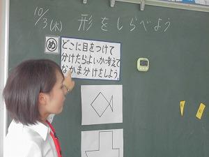 「形をしらべよう」という題材で、図形を分類することを学びました。最後には、なぜそのように分類したのかの理由付けを、グループで発表しまとめる学習を行いました。理由付けを言葉で表現することの難しさを感じていたようですが、みな一生懸命に取り組んでいました。