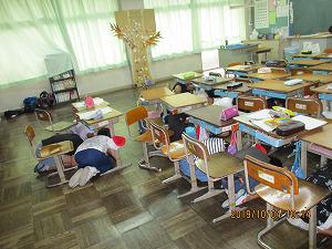 実施前には、「お・か・し・も・ち」の避難の約束や、竜巻襲来時の身を守る体勢「だんごむし」を学んでいます。なお、実施時間については、児童には予告せずに行いました。