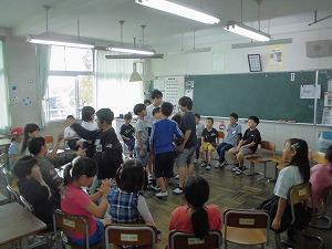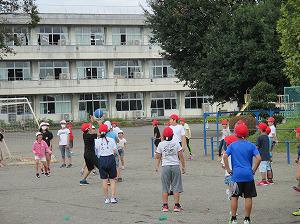 ボールを使ったゲーム形式「スケットボール」の提案授業です。スケットとは「助っ人」であり、攻撃側に一人助っ人が入り、ゴールにボールを当てるというものです。児童は、楽しそうに、また声を掛け合いながら工夫をして取り組んでいました。