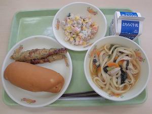 アップルパン 牛乳 きつねうどん ししゃもの磯辺フリッター ツナと大豆のサラダ