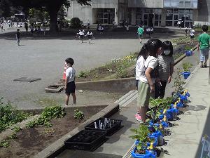 2年生 各自が育てている野菜に水やり「大きくなれ」 3年生 3種の花の種の発芽を観察中