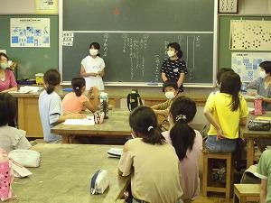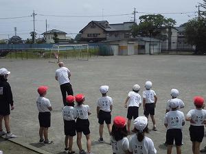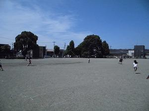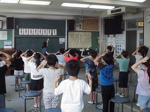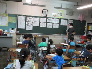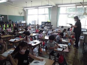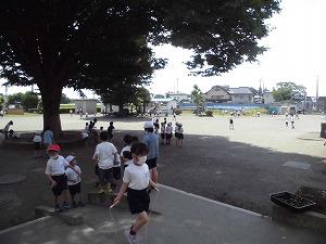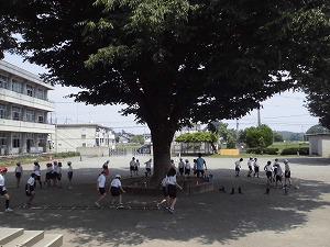 どの学級も、児童同士の間隔を意識したり、こまめな水分補給を心がけて授業を行っています。校庭で実施する場合は、大欅がとてもよい日よけになっています。