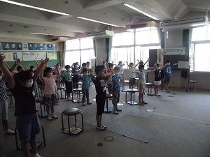 音楽室は、机を取り払い、一定の間隔をとった椅子に児童が座ります。