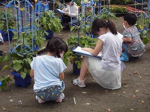だんだんと成長し、つるが支柱に巻き付き始めてきました。自分のあさがおを大切に扱いながら、観察シートに記録していました。早く色とりどりの花が咲くといいですね。