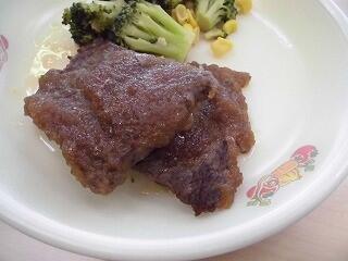 今日は「さつきランチ」です。今日の主菜は、「かぬま和牛」を使ったステーキです。「かぬま和牛」は、かぬまブランドにも認定された特産物で、高級なおいしいお肉です。ステーキにかかっているソースは、「宮のたれ」を使っています。他にも、ごはん・牛乳・汁物のなめこ、とちおとめゼリーなど、栃木県や鹿沼市でとれたものがたくさん使われています。よく味わっていただきましょう。
